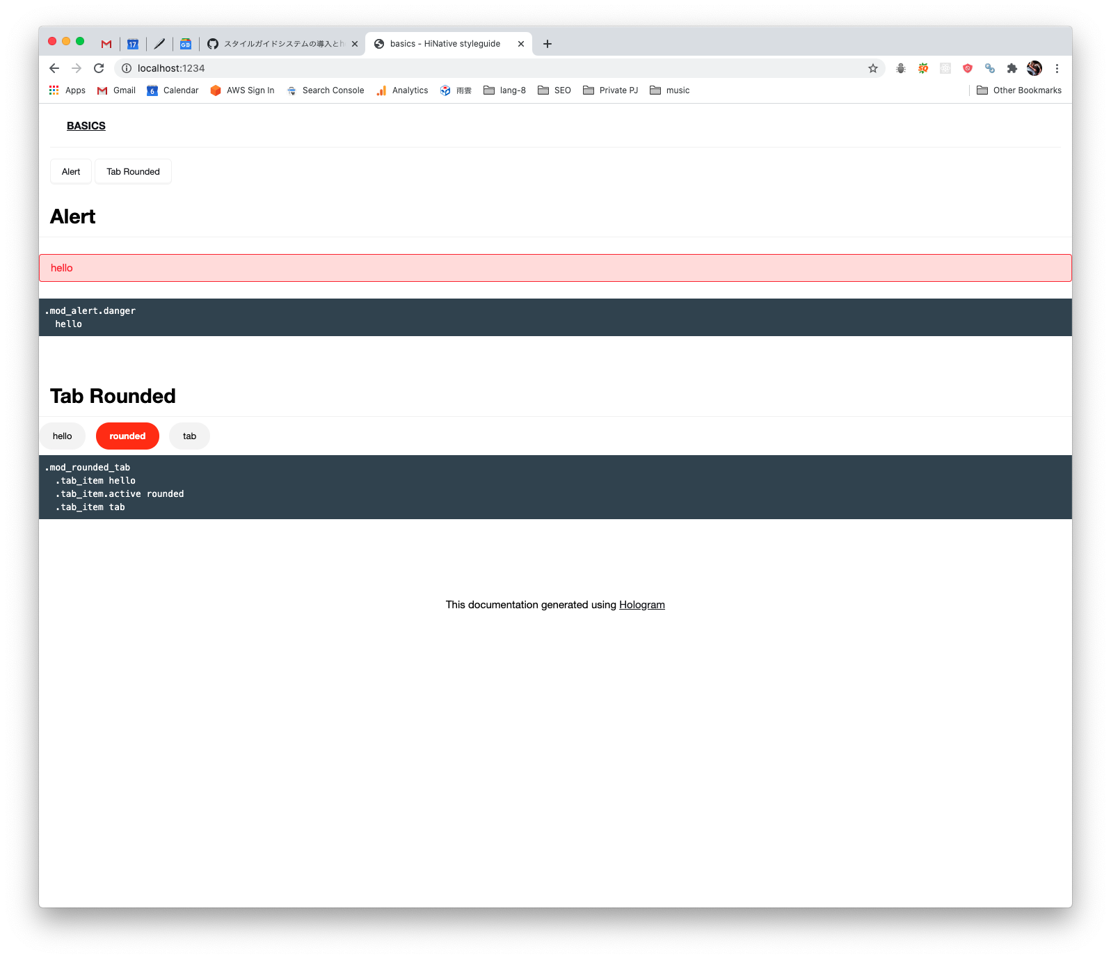 本来は「hologram -> 生成されたCSSを読むHTMLを吐き出す」という流れにしたいのですが、生成されたCSSのファイル名を取得する方法がhologram自体にはないので、そこは自前で書くしかありません。